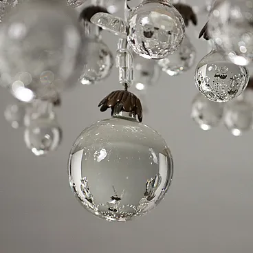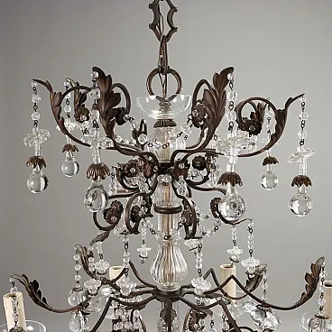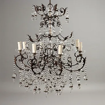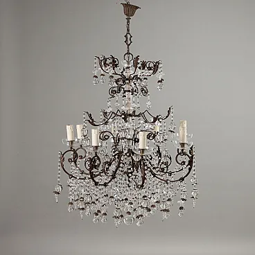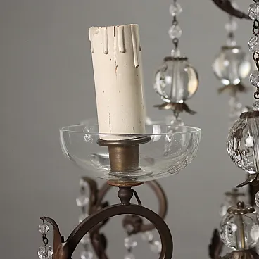 Lampadario a 8 luci in ottone brunito e decorazioni in vetro, '900
