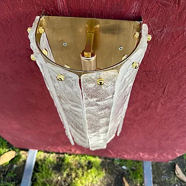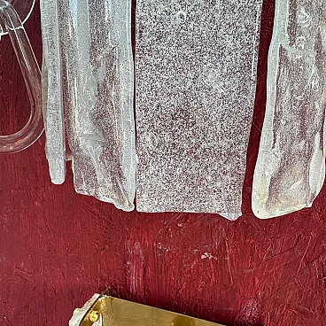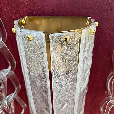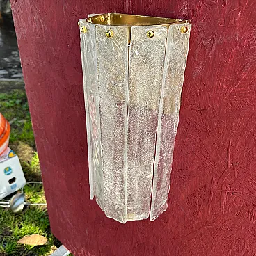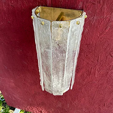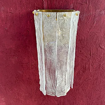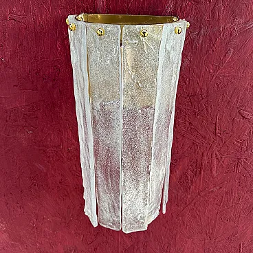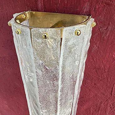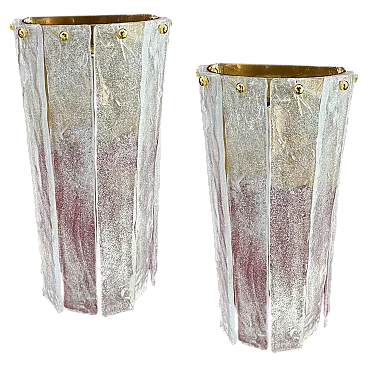 Questa coppia di appliques italiane in vetro di Murano, risalenti al Mid-Century Modern degli anni '80, presenta un'impressionante combinazione di artigianato e design artistico. Le applique sono caratterizzate da una forma scultorea e allungata con pannelli di vetro verticali, ognuno dei quali ha una finitura testurizzata e smerigliata con sottili accenni di colore, un mix di tonalità bianche e chiare. I pannelli sono fissati da piccole ed eleganti viti in ottone nella parte superiore, che rafforzano l'estetica raffinata e industriale. Il vetro di Murano, noto per l'alta qualità e la lavorazione a mano, sembra essere stato lavorato in una texture organica, quasi simile al ghiaccio, che conferisce alle applique una presenza unica e dinamica. L'interno in ottone offre una calda superficie riflettente per la luce, migliorando l'atmosfera dell'apparecchio. Queste applique incarnano sia l'opulenza che la semplicità modernista che definiscono l'illuminazione in vetro di Murano della metà e della fine del XX secolo. Sono in ottime condizioni generali e funzionanti, pronti per essere utilizzati negli Stati Uniti o in Europa.