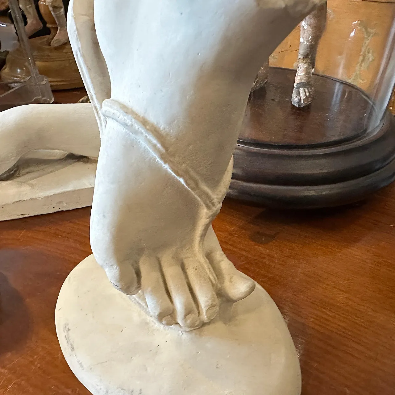 La scultura è molto dettagliata e mostra il realismo anatomico tipico dell'arte neoclassica dell'epoca. Il piede è posizionato come se stesse facendo un passo in avanti, con il perizoma del sandalo che avvolge le dita e la caviglia in modo coerente con le calzature greco-romane.