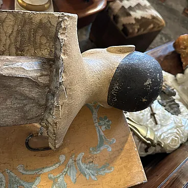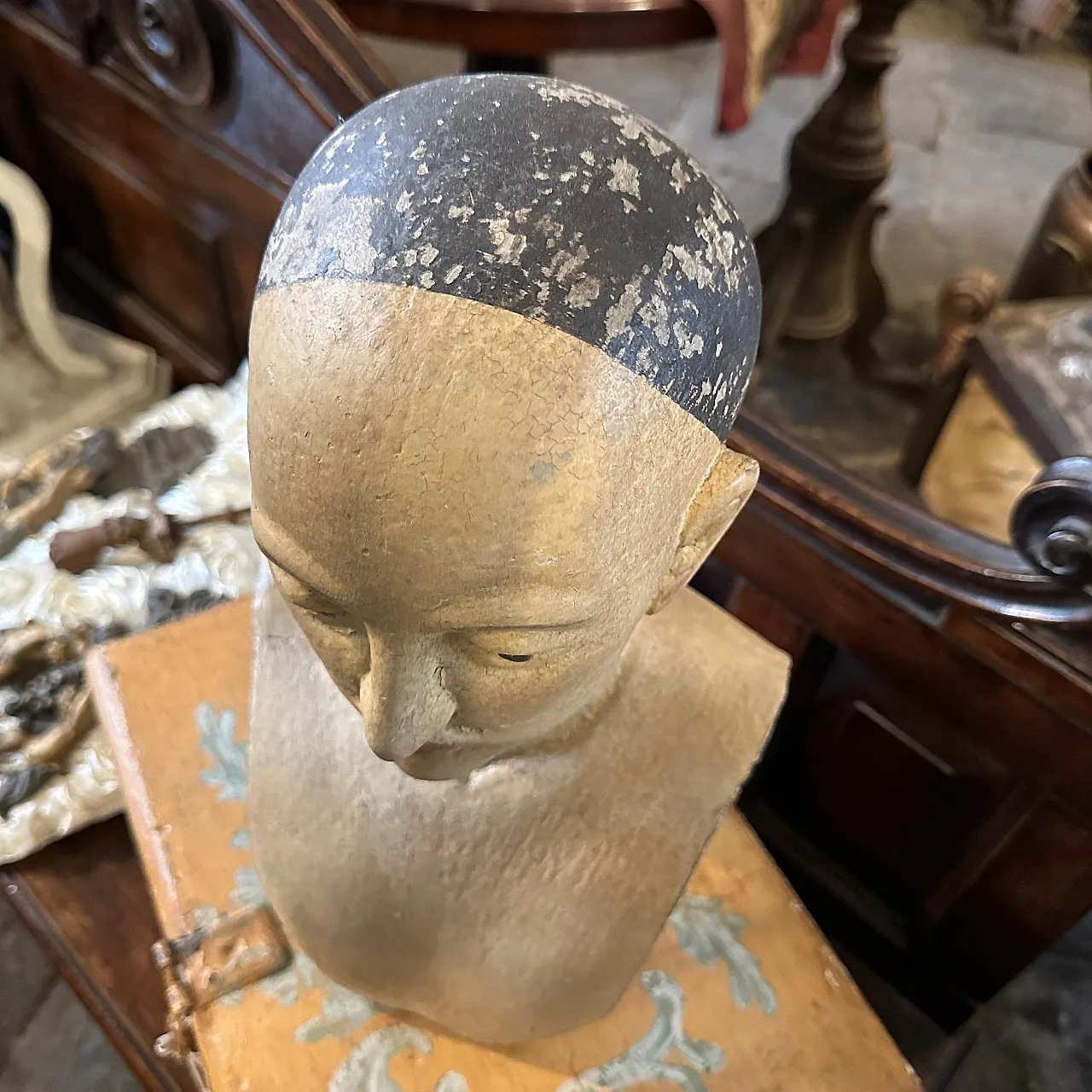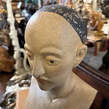 Un busto in legno laccato originario della Sicilia che rappresenta una figura femminile stilizzata. Il busto è scolpito in legno ed è rifinito con una superficie laccata e dipinta, ormai usurata dall'età. La donna ha lineamenti delicatamente scolpiti, sopracciglia arcuate, naso definito e labbra leggermente divaricate che conferiscono alla figura un'espressione serena e contemplativa. La perdita di vernice dà un'idea dell'età e dell'usura del pezzo. Il busto si interrompe appena sotto le spalle, formando una scollatura stilizzata, quasi geometrica. I dettagli sul petto sono minimi e concentrano l'attenzione sul viso. La semplicità e l'eleganza suggeriscono che questo potrebbe essere stato un pezzo devozionale o decorativo. Mostra le caratteristiche dell'arte religiosa siciliana legati a rappresentazioni tradizionali di santi o Madonne. Il pezzo mostra i segni dell'età, con un'usura visibile sulla superficie, soprattutto nella zona della testa. Questa patina ne accresce il fascino antico.