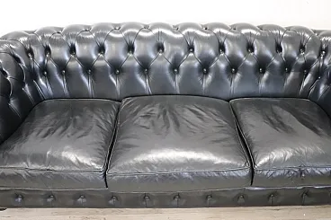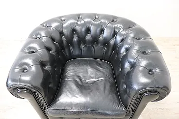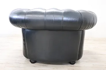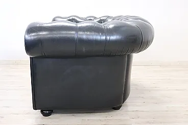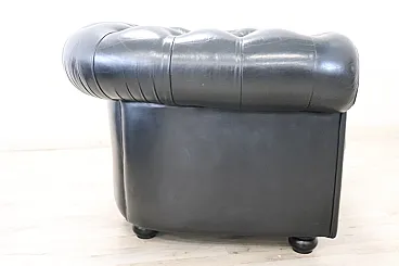 Divano e poltrona stile Chesterfield in pelle nera, anni '80