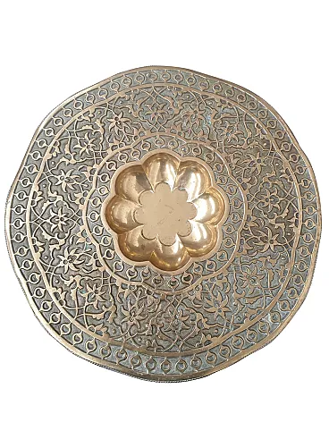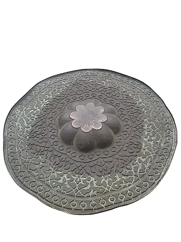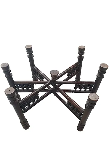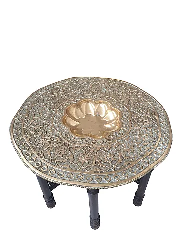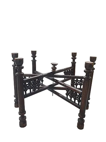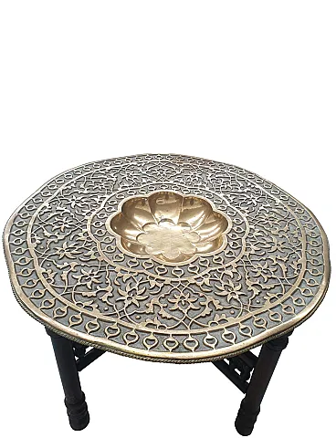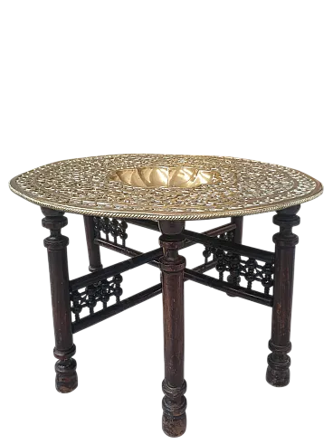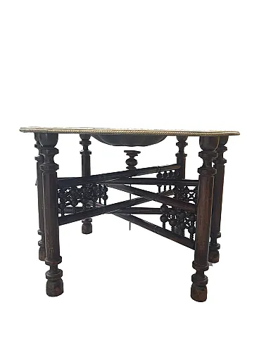 Tavolino da tè indo-anglo-indiano, ottone inciso e teak tornito, '900