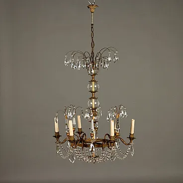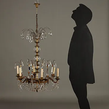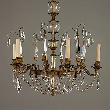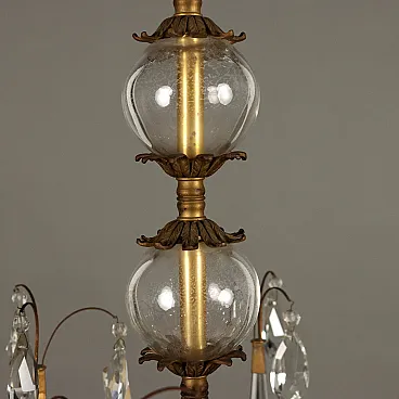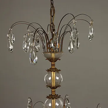 Lampadario in metallo brunito a 6 rami in vetro, '900