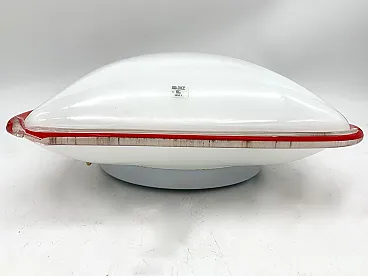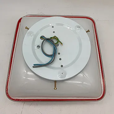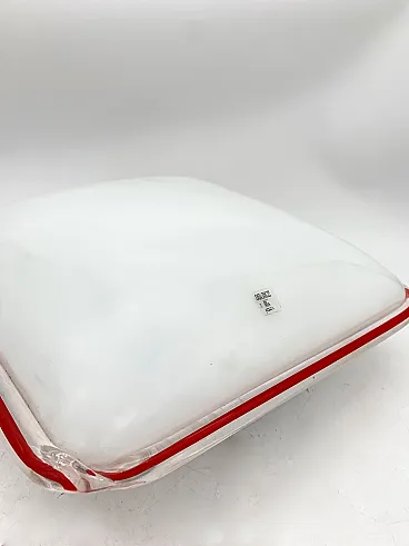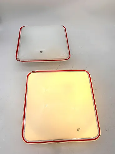 Interessante coppia di plafoniera o applique quadrata in vetro di murano attribuita alla ditta Venini. Vetro fatto a mano su stampo dai maestri muranesi. Vetro bianco con bordo rosso. Sul vetro ha il bollino 023 Struttura portante in ferro verniciato di bianco. Può essere una plafoniera o applique. All'interno c'è un portalampada e 27 ad applique. Impianto elettrico nuovo.