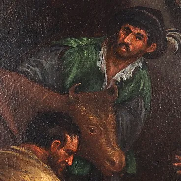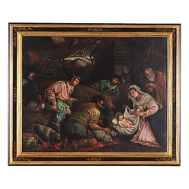 Anche in questo dipinto la Sacra Famiglia non caratterizza la centralità della scena, ma è uno dei due gruppi di umanissime figure che occupa la parte destra della scena, mentre a sinistra campeggia il gruppo di pastori con gli animali della campagna e i semplici oggetti della vita quotidiana.