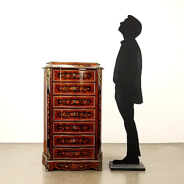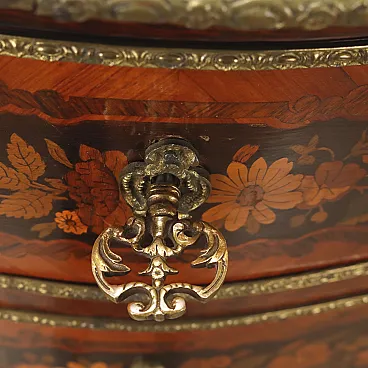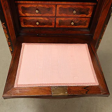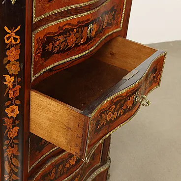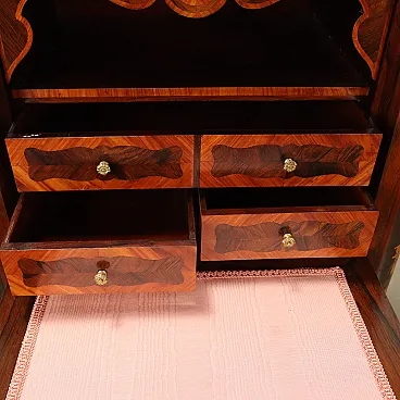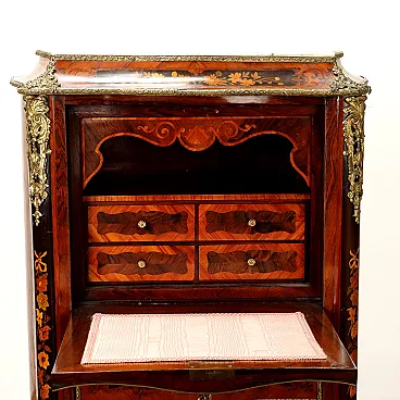 Secretaire in stile rococò realizzato alla fine dell'800. Mosso nelle forme si presenta come un settimanale, ma i primi tre cassetti sotto piano sono in realtà un'anta a ribalta celante scarabattolo con cassetti e vano a giorno. tutta la superficie è impiallacciata in essenze esotiche, anche l'interno e finemente intarsiata all'esterno con motivi floreali realizzati in varie essenze e legni tinti. nella parte superiore un movimento mosso a rientrare accoglie il marmo. Su tutta la superficie troviamo cornici e applicazioni di bronzi in stile rococò finemente cesellati.