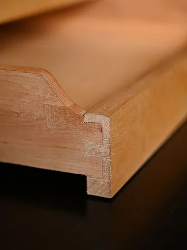 Sideboard Art Decó scandinavo risalente agli anni ’30, realizzato in radica di legni misti con venature profonde e intarsi decorativi sul fronte. L’anta a battente con chiave rivela un interno in legno chiaro con mensole e una colonna di cassetti. La costruzione geometrica e il contrasto cromatico ne enfatizzano l’eleganza.