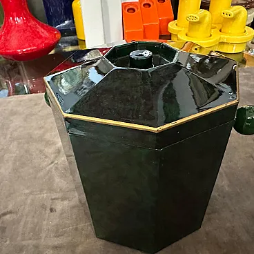 Questo secchiello per il ghiaccio esagonale italiano del Mid-Century Modern degli anni '70 è un esempio lampante del design audace ma raffinato di quell'epoca, che combina l'alta qualità con la qualità dei prodotti. In lucite e con forme geometriche. Questo secchiello per il ghiaccio è stato un pezzo forte dell'intrattenimento, utilizzato per contenere il ghiaccio per i cocktail o come oggetto decorativo su un carrello da bar. Il suo mix di materiali e forme lo rende un pezzo forte, adatto ad aggiungere un tocco di raffinatezza retrò a qualsiasi ambiente. Questa specifica lucite finta malachite fa sì che rimanga un ricercato oggetto da collezione, che riflette la decadenza e l'audacia del design degli anni '70. Il corpo del secchiello è realizzato in finta malachite lucida, nota per il suo colore verde intenso, che imita l'aspetto lussuoso della malachite vera. Il secchio È in ottime condizioni, probabilmente mai usato.