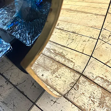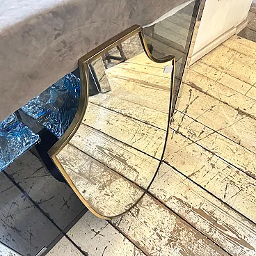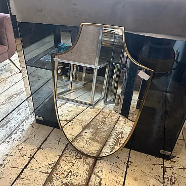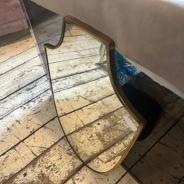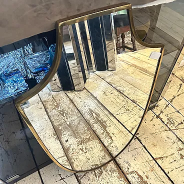 Uno specchio da parete in ottone massiccio progettato e realizzato in Italia alla maniera di Gio Ponti, che utilizzava questo tipo di specchio nelle più belle case milanesi degli anni '50. L'ottone vanta una bella patina originale, mentre il vetro rimane originale. La forma a scudo era un segno distintivo degli specchi disegnati da Gio Ponti. Lo specchio da parete è uno splendido pezzo di design vintage che incarna l'essenza dell'estetica della metà del secolo scorso, mostrando la sua caratteristica miscela di funzionalità, eleganza e influenze moderniste. Con la sua presenza audace e accattivante, diventa un punto focale in qualsiasi stanza. La forma dello scudo ricorda gli scudi delle antiche armature, aggiungendo un tocco di riferimento storico al design. La cornice dello specchio è realizzata in ottone massiccio, un materiale molto diffuso nella metà del secolo scorso. La calda tonalità dorata dell'ottone completa la superficie riflettente dello specchio, creando un effetto visivo armonioso. La struttura in ottone è elegante e minimalista, con linee pulite e una finitura liscia che mette in mostra la semplicità e la raffinatezza del design moderno di metà secolo. Lo specchio stesso è di grandi dimensioni e consente di riflettersi e di fungere da elemento funzionale e decorativo nella stanza. La sua superficie riflettente, chiara e priva di fronzoli, enfatizza lo scopo dello specchio e migliora l'illusione di spazio e luce nell'area circostante. Questo specchio da parete racchiude lo spirito del design degli anni '50, combinando forme organiche e geometriche con materiali di alta qualità per esemplificare l'impegno dell'epoca sia per la forma che per la funzione. Si tratta di un pezzo di design senza tempo che continua a ispirare e affascinare gli appassionati dell'estetica moderna di metà secolo.