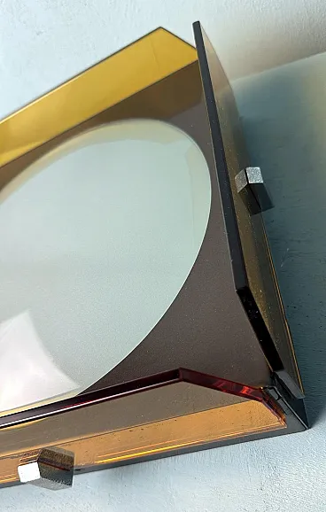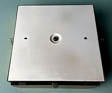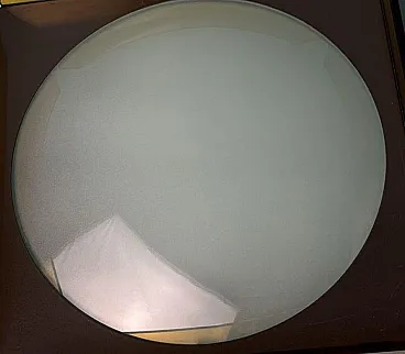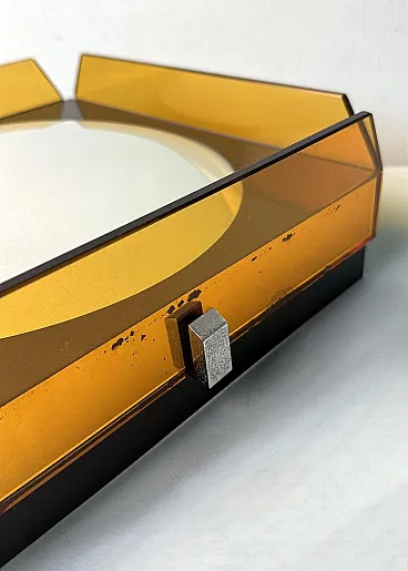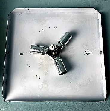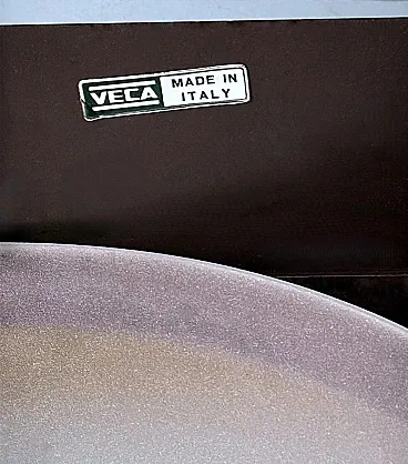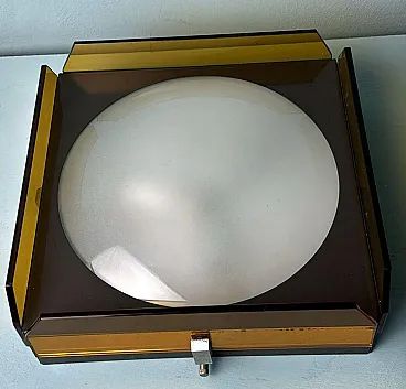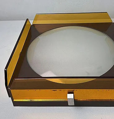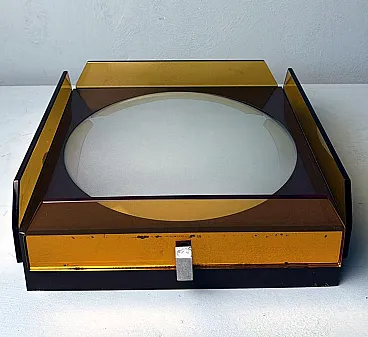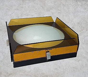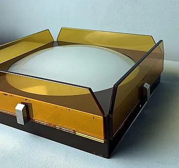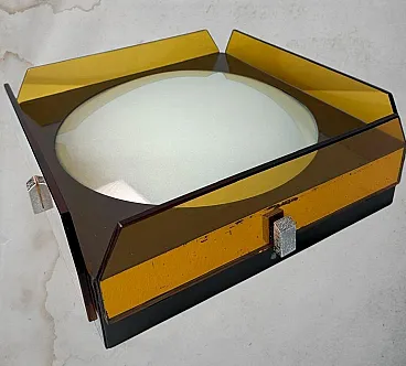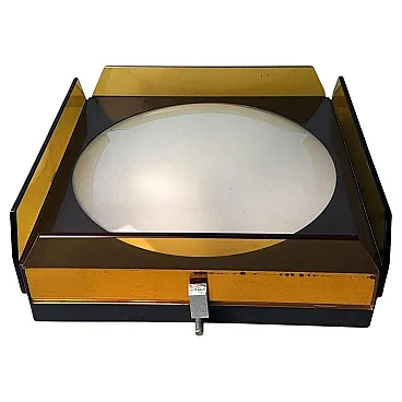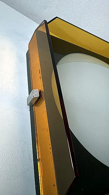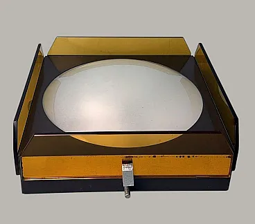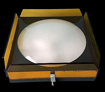 Questa iconica plafoniera dalle dimensioni generose presenta una struttura in metallo con elementi trapezoidali in cristallo di un vivace giallo luminoso. Al centro, un diffusore rotondo in vetro concavo assicura una distribuzione uniforme della luce. Il retro, realizzato in metallo smaltato bianco, presenta due fori per facilitare il montaggio, consentendo di installare l'apparecchio sul soffitto o di utilizzarlo come applique. Un foro centrale sul retro permette ai fili elettrici di passare e di collegarsi a un supporto interno dotato di tre prese per lampadine. Prodotto tra il 1970 e il 1973 dall'azienda italiana Veca (l'etichetta originale Veca è apposta all'interno della cornice metallica, vedi foto), questo pezzo potrebbe essere il risultato di una collaborazione con Fontana Arte. Veca è un produttore italiano noto per la produzione di accessori per il bagno in vetro e metallo, particolarmente attivo durante l'era del design moderno della metà del XX secolo. Sebbene la storia dell'azienda sia poco documentata, si distingueva per la qualità e l'eleganza dei suoi prodotti, spesso caratterizzati da vetro colorato e finiture in metallo cromato. Fontana Arte, fondata a Milano nel 1932 da Luigi Fontana e Gio Ponti, è un nome di spicco del design italiano. Specializzata nell'artigianato del vetro e nell'arredamento decorativo, l'azienda è particolarmente rinomata per i suoi innovativi progetti di illuminazione. Negli anni '60 e '70 Fontana Arte collaborò con molti designer di spicco, mantenendo sempre il vetro come materiale caratteristico delle sue creazioni. Sebbene nessuna documentazione ufficiale confermi una collaborazione diretta o a lungo termine tra Veca e Fontana Arte, è plausibile che Veca abbia fornito componenti o prodotto pezzi per Fontana Arte in determinati periodi, data la loro comune esperienza nella lavorazione del vetro e del metallo. Eleganza, raffinatezza e funzionalità: questa plafoniera crea atmosfere calde, eteree e avvolgenti, diffondendo un bagliore che cattura lo sguardo e l'immaginazione. Con il suo design minimalista, le linee pulite e la disposizione equilibrata dei pannelli di cristallo, è un oggetto decorativo unico e versatile, perfetto per qualsiasi ambiente interno. Più che un semplice apparecchio di illuminazione, è una vera e propria dichiarazione di stile. La plafoniera è in buone condizioni d'epoca e presenta alcuni segni dovuti all'età, come una leggera ossidazione sui supporti interni delle prese e sui componenti nichelati, oltre ad alcune macchie sotto i pannelli di cristallo. Il cablaggio a standard europeo è facile da collegare: basta attaccare i fili elettrici alla morsettiera collegata alle prese e farli passare attraverso il foro centrale posteriore per collegarli alla presa a muro. Dimensioni: Larghezza: 32 cm Profondità: 32 cm Altezza: 11 cm