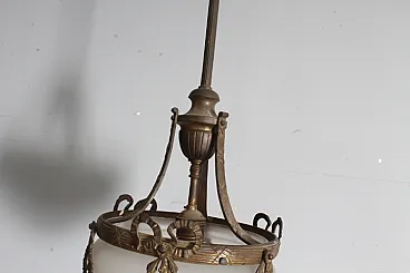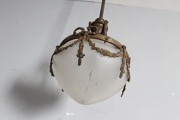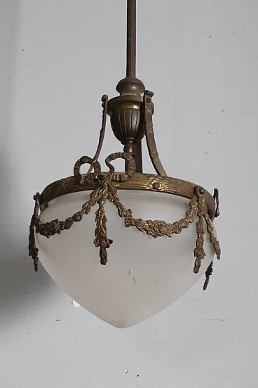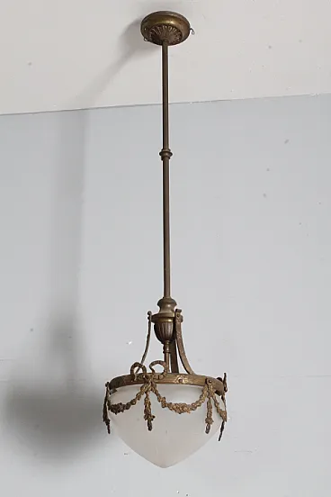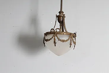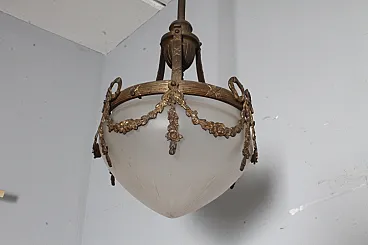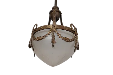 Lampadario liberty vetro opalino e bronzo, 1930