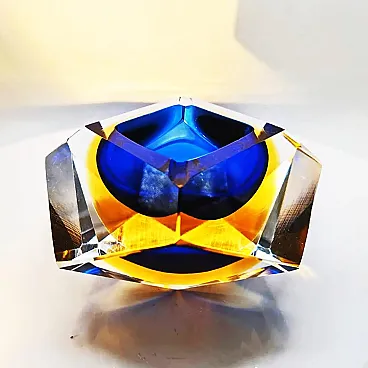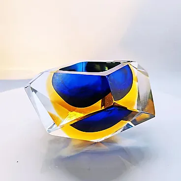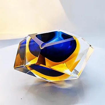 Grande posacenere o contenitore in vetro di Murano di Flavio Poli per Seguso. Due splendidi colori sommersi: Blu e Giallo oro. Anni '60, realizzato a Murano - Italia. Condizioni eccellenti.
