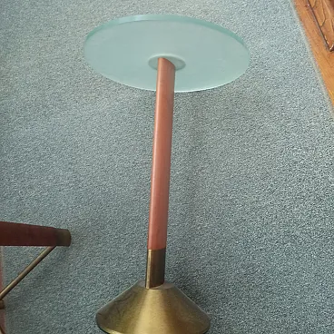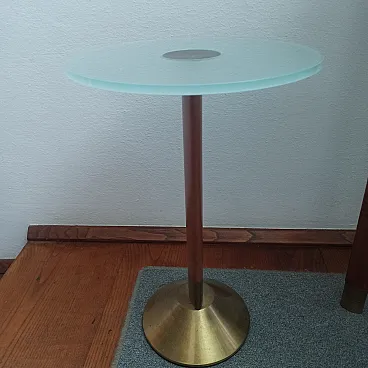 Tavolino rotondo di Daniela Puppa per Fontana Arte, anni '80. Piano in cristallo, sostegno in legno e base in ottone. Riporta normali tracce del tempo e dell'utilizzo; qualche segno sul piano. Daniela Puppa, architetto e designer poliedrico, ha fatto dello stile e dell'eleganza il proprio tratto distintivo. Parole d'ordine: energia e curiosità applicate al product e fashion design. Laureata al Politecnico di Milano, inizia come redattrice della rivista Casabella e partecipa alla nascita di Modo. Al mondo del design si avvicina attraverso le sperimentazioni con i gruppi di Alchimia e Memphis. Da allora non si è più fermata, spaziando dal mondo del mobile, all'illuminotecnica, al textile design. In parallelo, a Parigi collabora come designer di accessori per il gruppo LVMH e Dior. Con Fontana Arte ha una relazione di lunga data: nei primi anni '80 - sotto la direzione artistica di Gae Aulenti - progetta insieme a Franco Raggi gli allestimenti per gli eventi che vedono protagonista l'azienda. Nel 1992 disegna per l'azienda milanese Prima Signora, lampada da terra dall'eleganza intramontabile. Svolge attività didattica al Politecnico di Milano nella Facoltà di Disegno Industriale, allo IULM e alla Domus Academy di Milano, dove tiene seminari ed è relatrice di progetti che riguardano le connessioni tra il sistema moda e design.