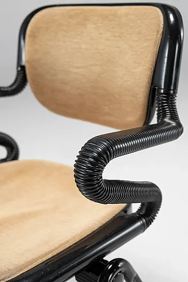 La plastica tubolare flessibile scelta per coprire i braccioli è sia una scelta estetica, che evoca i progressi tecnologici del giorno, sia pratico, poiché ospita il meccanismo che consente allo schienale di ruotare e regolare comodamente. La seconda inovazione diventa anche evidente solo quando si è seduta: il sedile, dotato di potenti sorgenti, scivola in avanti quanto basta per tenerne una in una posizione comoda ed ergonomica. Se si desidera allungarsi un po ', anche ciò è possibile, poiché lo schienale può reclinarsi ancora di più e il sedile può scivolare ulteriormente.