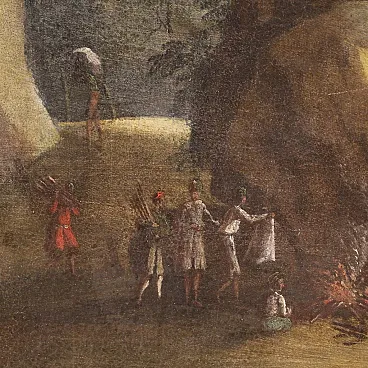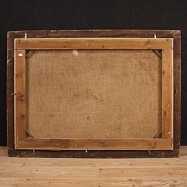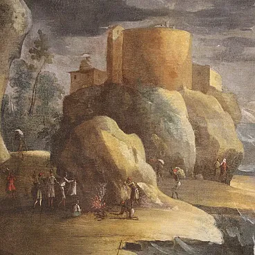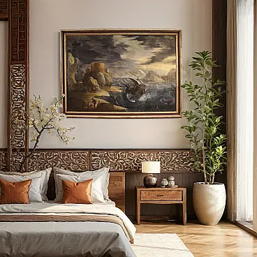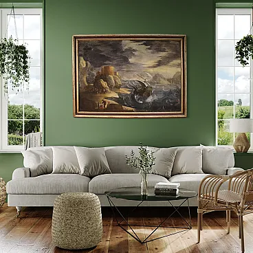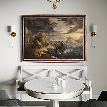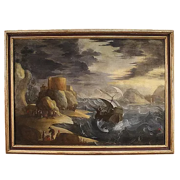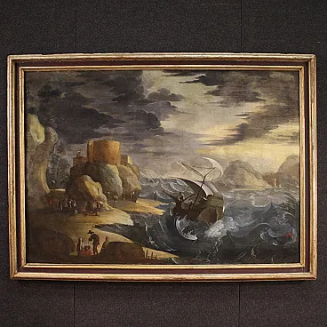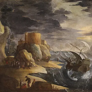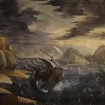 Grande marina italiana della seconda metà del XVII secolo. Opera ad olio su tela raffigurante un porto con il mare in tempesta, di notevole qualità pittorica. Al centro della composizione troviamo un veliero in balia di onde tumultuose che rischia il naufragio sotto un cielo drammatico e dai toni plumbei. Sulla costa intravediamo invece un castello arroccato e numerose figure a lavoro, ben caratterizzate e ricche di dettagli. Cornice del XX secolo in legno intagliato, laccato e dorato, con alcuni segni del tempo. Opera già restaurata con rintelo, sostituzione del telaio e ripresa del colore in piccoli punti. Nel complesso in buono stato conservativo. Luce dipinto H 104 x L 148 cm.