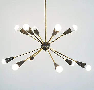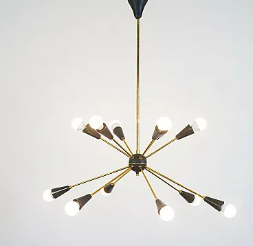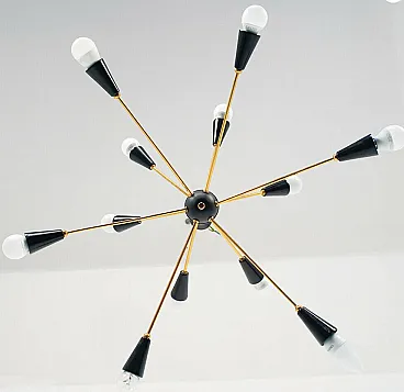 Lampadario Sputnik con 10 punti luce in ottone e coni nero, anni '60