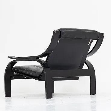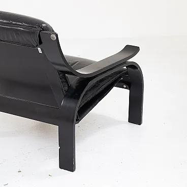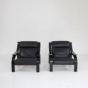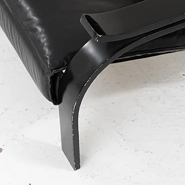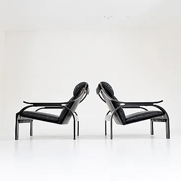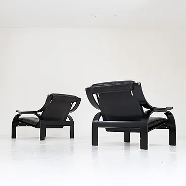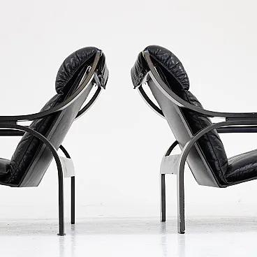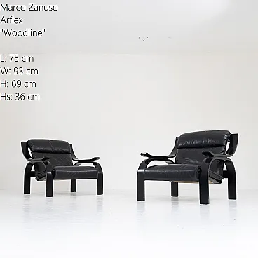 Eleganti e scultoree, queste poltrone modello ""Woodline"" sono un progetto iconico del celebre designer Marco Zanuso per Arflex (marchio del produttore presente), risalente agli anni ’60. La struttura in legno curvato laccato nero dona al pezzo un profilo fluido e sofisticato, mentre la seduta e lo schienale imbottiti garantiscono un comfort eccellente. Il rivestimento originale in pelle nera conserva una piacevole patina del tempo.