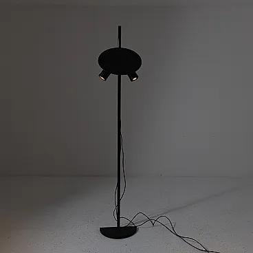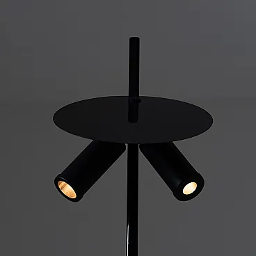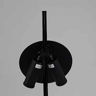 La struttura è in metallo verniciato nero, composta da una base semicircolare e uno stelo sottile che sostiene due spot orientabili con riflettore circolare superiore. La doppia testa orientabile consente una regolazione direzionale della luce, ideale sia per lettura che per illuminazione d’accento.