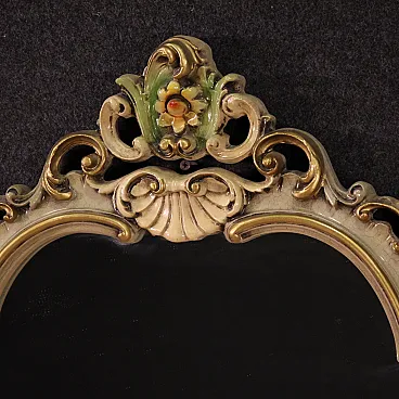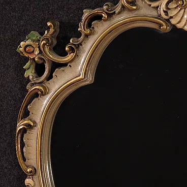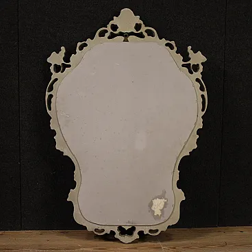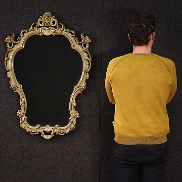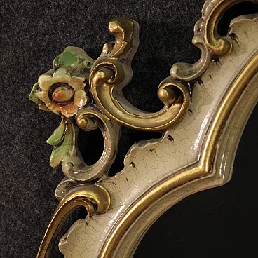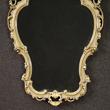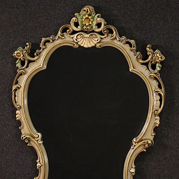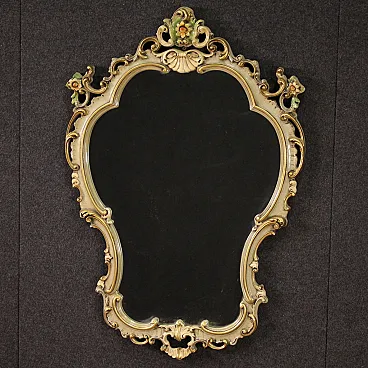 Specchiera veneziana della seconda metà del XX secolo. Mobile in legno e gesso, scolpito, laccato e dorato di bella decorazione. Specchiera di ottima proporzione, facilmente inseribile in diversi punti della casa. Specchio originale perfettamente riflettente. Specchiera in buono stato conservativo.
