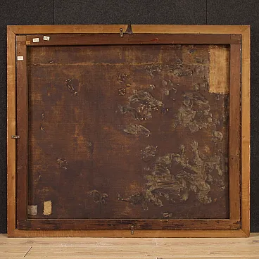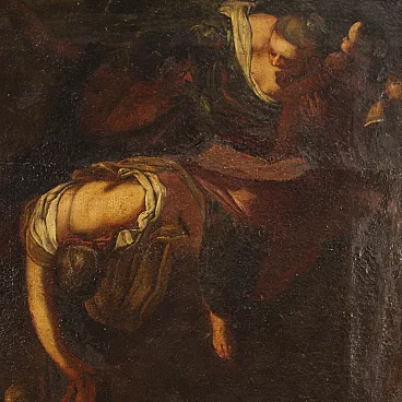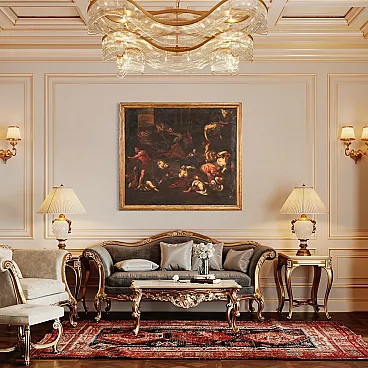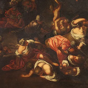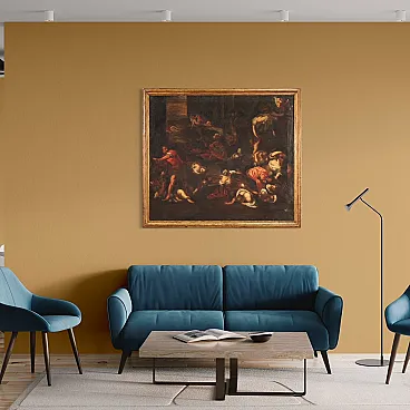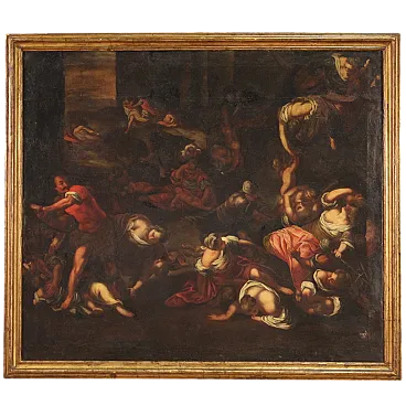 Antico dipinto italiano della prima metà del XVII secolo. Quadro ad olio su tela, in prima tela, raffigurante copia di alta qualità della strage degli innocenti di Jacopo Robusti detto Tintoretto. L'opera si presenta come speculare rispetto all'originale del maestro presente nella scuola di San Rocco a Venezia. Secondo il racconto evangelico Erode il grande, Re di Giudea, ordinò il massacro di bambini con lo scopo di uccidere Gesù, della cui nascita era stato informato dai Magi venuti da oriente. Un angelo avvisò in un sogno Giuseppe ordinandogli di fuggire in Egitto e solo dopo la morte di Erode tornò in Galilea. Opera di ottima qualità pittorica caratterizzato da un grande dinamismo e un sapiente uso del chiaroscuro. Cornice lignea del XX secolo scolpita e dorata, di piacevole decorazione, con alcuni segni del tempo. Dipinto che ha subito un intervento di restauro con rintelo parziale e ripresa del colore in alcuni punti (vedi foto). Nel complesso in buono stato conservativo. Luce dipinto H 112,5 x L 130 cm.