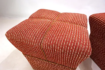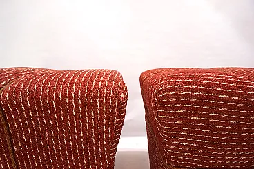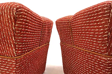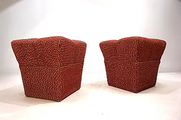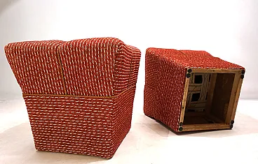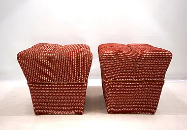 Magnifica coppia di sgabelli classici degli anni Trenta con tappezzeria originale in ottime condizioni. Il tessuto rosso mattone a righe bianche presenta minimi segni di usura. La corda che sostiene la forma delle sedie è impeccabile e resistente. I pouf hanno un'insolita forma cubista affusolata. Offrono una seduta confortevole grazie alle molle della seduta, anch'esse in ottime condizioni.