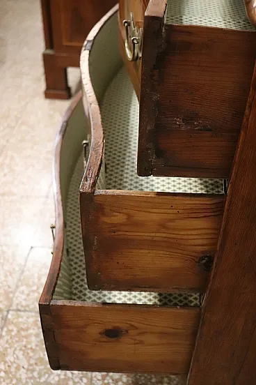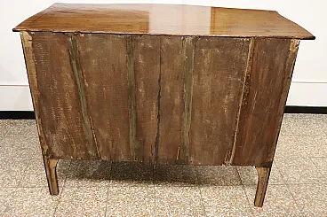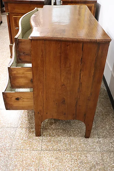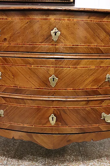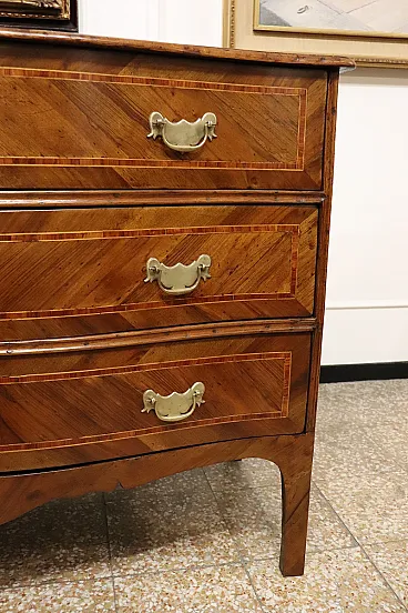 Presentiamo questo elegante cassettone italiano antico risalente alla metà del XVIII secolo, periodo Luigi XV. Un cassettone estremamente raffinato, le cui caratteristiche fanno pensare che sia stato realizzato nelle botteghe ebanistiche dell'Italia settentrionale, in particolare della Liguria. Realizzato in legno massello di carrubo. Il carrubo (Ceratonia siliqua) è un albero da frutto sempreverde appartenente alla famiglia delle leguminose. I suoi frutti, le carrube, sono baccelli appiattiti e allungati, di colore marrone scuro e dal sapore dolce. Questo legno veniva utilizzato anticamente dagli ebanisti italiani, in particolare della Liguria, per la produzione di mobili di alta qualità, molto apprezzati per la loro durezza. Questa cassettiera è caratterizzata da un colore miele chiaro che mette in risalto l'elegante decorazione geometrica intarsiata nel legno che impreziosisce ogni lato della cassettiera. Il decoro è di chiaro gusto classico e personalizza la cassettiera senza appesantirla eccessivamente. La sua forma bombata sul fronte e gli esili piedini rispecchiano perfettamente il gusto dell'epoca storica che voleva mobili non troppo lineari ma mossi con estrema eleganza e raffinatezza. dal punto di vista funzionale, è dotato di tre comodi cassetti rivestiti in carta. Potete certamente pensare di collocare questa preziosa cassettiera in qualsiasi ambiente della casa e valorizzarla abbinandola a un bel quadro o a un bello specchio. Ovunque decidiate di collocarla, diventerà un punto focale ammirato e invidiato da tutti i vostri ospiti. Il cassettone è in ottime condizioni, è stato eseguito un restauro conservativo che ne ha esaltato le caratteristiche estetiche senza cancellare il suo passato storico. Un cassettone così imponente è sicuramente un'opera d'arte di ebanisteria, aggiungetelo alla vostra collezione di mobili antichi.