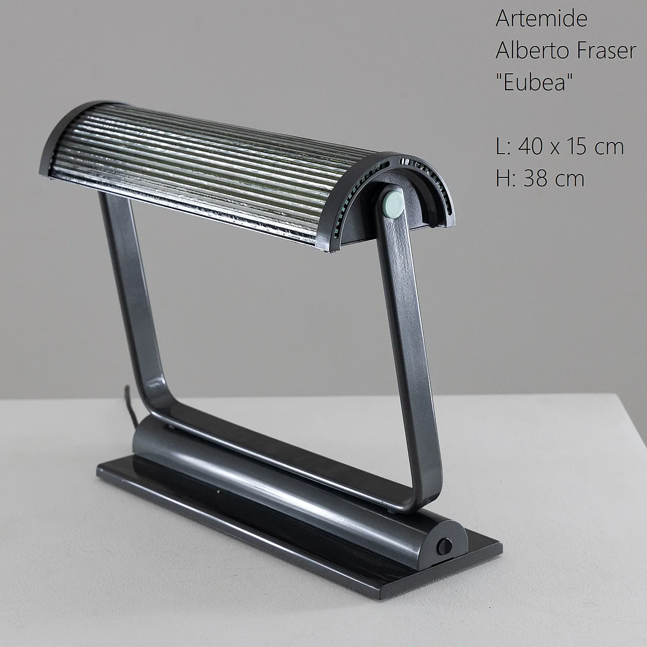 Iconica lampada da tavolo modello ""Eubea"", disegnata da Alberto Fraser per Artemide negli anni '80. Questo oggetto unisce l’estetica industriale al design funzionale, con una struttura in metallo verniciato nero e un diffusore a lamelle in vetro che produce una luce filtrata e tecnica, perfetta per ambienti di lavoro o contesti contemporanei. Il braccio orientabile consente di regolare facilmente l’inclinazione del fascio luminoso, rendendo la lampada particolarmente adatta per scrivanie, librerie o studi. Il dettaglio delle aperture ad arco illuminate nella parte superiore del corpo aggiunge un tocco decorativo sofisticato, anche quando la lampada è accesa. Condizioni: ottime condizioni vintage, piccoli segni del tempo. Presente etichetta originale del produttore. Elettrificazione: da verificare / eventualmente da aggiornare.