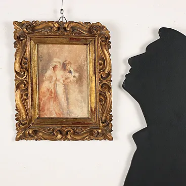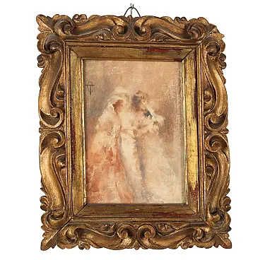 Acquarello su carta. Monogramma dell'artista in alto a sinistra. Tranquillo Cremona, dopo un primo periodo vicino alla pittura romantica, a partire dal 1870 si allontanò dalle influenze di Francesco Hayez e assunse una pittura dai contorni indefiniti, elaborando insieme all'amico Daniele Ranzoni il concetto di "macchia scapigliata": dopo un primo intervento con i pennelli, rifiniva le opere con le dita per sfumare, utilizzando tutte le dita per rendere la massima vaporosità ai propri dipinti. Tale tecnica (che gli costò la vita per l\'intossicazione da piombo dovuta al contatto ripetuto sulla pelle dei colori) fu paragonata da Camillo Boito alle vedute della lanterna magica, quando non ancora si è trovato il giusto fuoco della lente: l'immagine già si distingue, ma è immersa in un vapore quasi aeriforme. I soggetti delle opere di Tranquillo Cremona furono sempre figure umane, presenti nelle scene storico-letterarie del periodo romantico, come nei ritratti e nelle scene di genere della fase scapigliata; i suoi soggetti erano presi dalla vita quotidiana, nella sua semplicità e immediatezza spontanea, come queste tre figure femminili raffigurate in un momento di conversazione confidenziale e intima tra amiche. L'opera è presentata in cornice di fine '800.