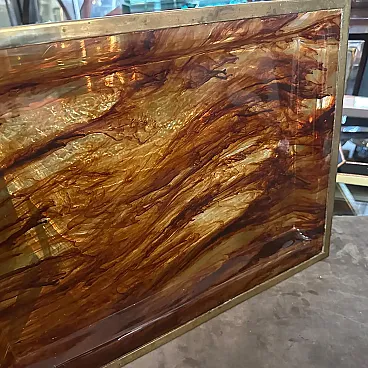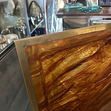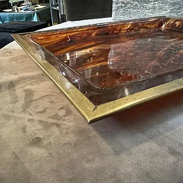 Questo vassoio rettangolare di Ulderico Cavinato incarna lo spirito della sua epoca, fondendo materiali all'avanguardia con principi di design senza tempo per creare un'opera d'arte visivamente sorprendente e funzionale, che esemplifica la sensibilità del design elegante e all'avanguardia degli anni '80, sposando materiali innovativi con l'estetica contemporanea. Ulderico Cavinato, noto per la sua ingegnosità nel design, ha realizzato questo vassoio con un occhio attento ai principi modernisti e al lusso. La struttura in finta lucite tartarugata del vassoio conferisce un'aria di eleganza e raffinatezza al pezzo. Il materiale Lucite non solo garantisce la durata nel tempo, ma contribuisce anche all'estetica trasparente e minimalista del vassoio, permettendo agli elementi in ottone di risaltare. La struttura in ottone del vassoio è caratterizzata da linee pulite e forme geometriche, tipiche del design modernista. Questi accenti aggiungono un tocco di raffinatezza e opulenza, contrastando meravigliosamente con la qualità traslucida della lucite. La combinazione di lucite e ottone crea un armonioso gioco di luci e riflessi, esaltando il fascino visivo del vassoio, che funge da accessorio versatile per servire bevande, antipasti o esporre oggetti decorativi. Il suo design modernista e la sua costruzione di alta qualità lo rendono un pezzo forte adatto a qualsiasi ambiente contemporaneo. Il vassoio è in buone condizioni generali.