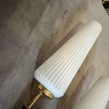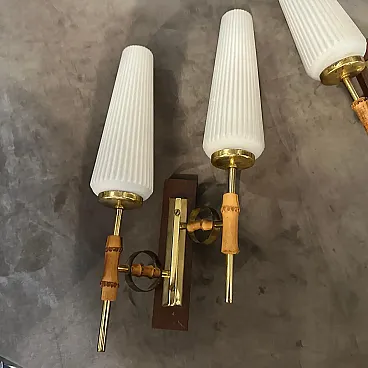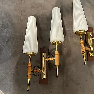 Si tratta di squisite applique italiane Mid-Century Modern degli anni '50, un mix perfetto di materiali naturali e design elegante che incarna l'estetica dell'epoca. L'ottone aggiunge una finitura metallica calda e lucida, migliorando l'atmosfera generale di lusso. Ogni braccio presenta una sezione di vero bambù, aggiungendo un elemento organico e terroso che contrasta magnificamente con il metallo e il vetro. I paralumi alti e scanalati in vetro opalino o lattimo diffondono la luce in modo morbido e conferiscono un aspetto scultoreo ed elegante. La forma allungata delle paralumi verticali in vetro attira lo sguardo verso l'alto, contribuendo a creare un senso di altezza ed eleganza, mentre il supporto rettangolare in legno conferisce al pezzo una presenza architettonica e solida. I dettagli raffinati e attenti del design riflettono la precisione e la maestria tipica dell'illuminazione italiana di metà secolo e in particolare del famoso produttore Stilnovo. Queste applique sono perfette per affiancare uno specchio, un letto o una porta, conferendo funzionalità e stile senza tempo a un ambiente. Sono ideali soprattutto per gli amanti dell'arredamento vintage, degli interni retro-moderni o degli spazi eclettici che apprezzano le texture e i materiali misti. sono funzionanti e in buone condizioni vintage.
