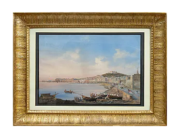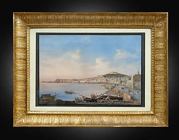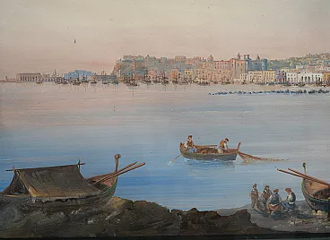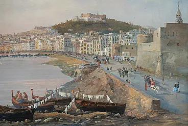 Il nostro raffigura una veduta di napoli vista da via marina,con il borgo dei pescatori in primo piano e la collina di posillipo sullo sfondo.