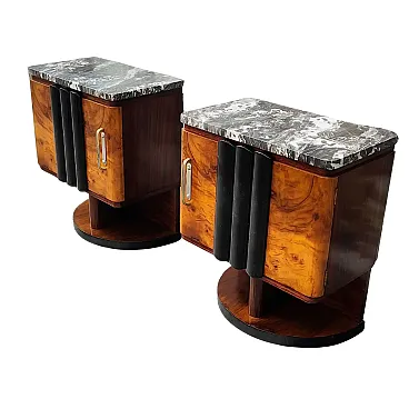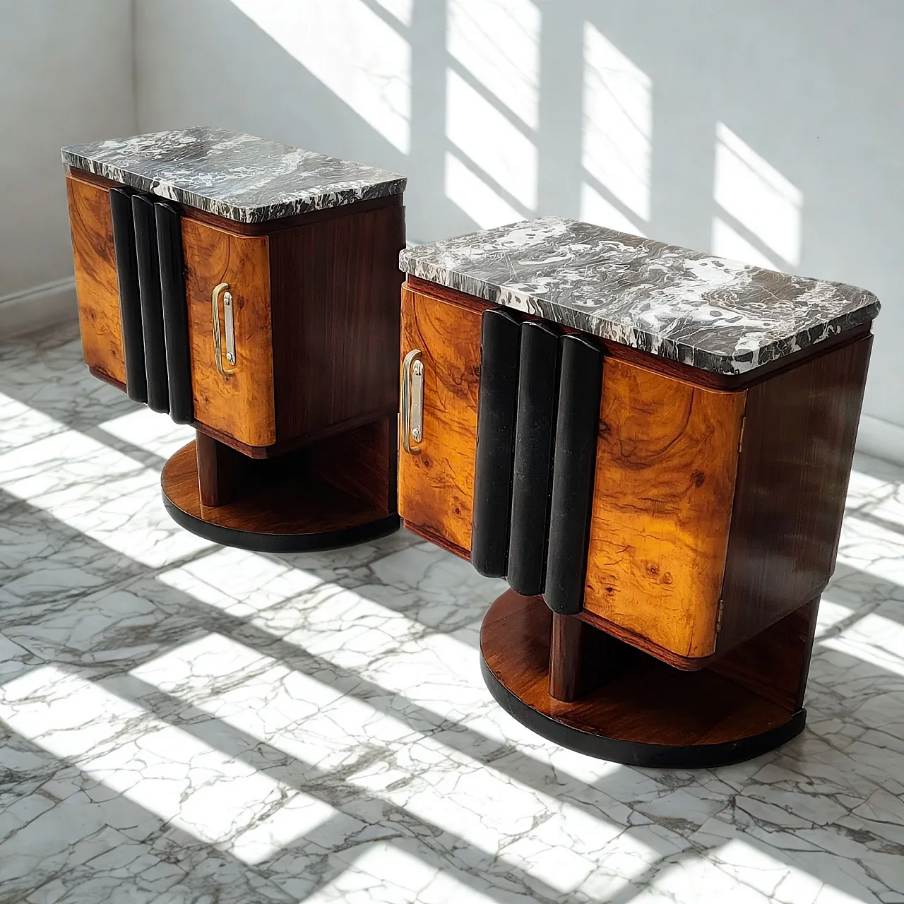 Coppia di comodini Art Déco anni '30 in impiallacciatura mista di legno e marmo nero originale