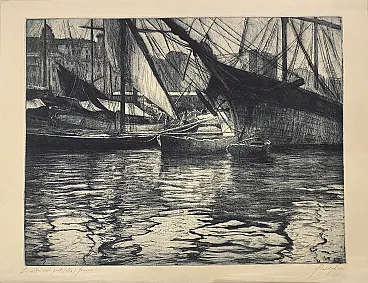 Animata veduta a pelo d’acqua di barche nel porto di Genova. L’autore restituisce l’effetto di un raggio di sole che indora le vele al centro della composizione e si riflette sull’acqua appena mossa. In basso a destra monogramma inciso. Oltre l’immagine a matita firma e titolo autografo: La vita nel porto (n4) Genova. La lastra fa parte di una serie di vedute del porto di Genova eseguite nel 1915. La lastra n1 è stat esposta alla mostra di Milano del 1982 ed è riprodotta su Risorgimento grafico, anno XII, n3, marzo 1915.