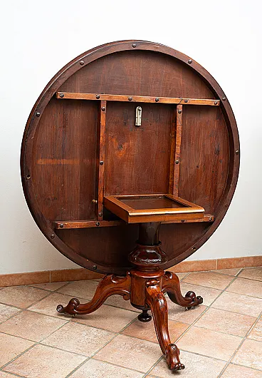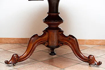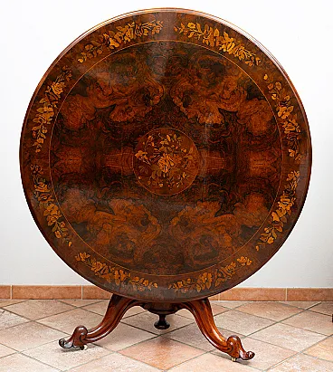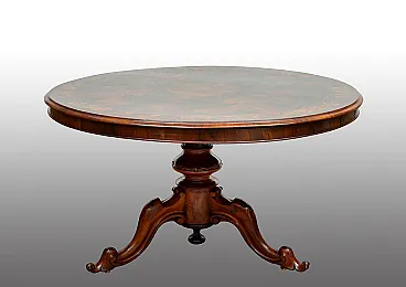 Descrizione: Tavolo a piede centrale Vittoriano in radica di noce con piede terminante con rotelle coeve.