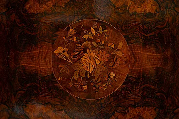 Il piano presenta una forma circolare arricchito nel centro e sul bordo da un intarsio a motivo floreale.