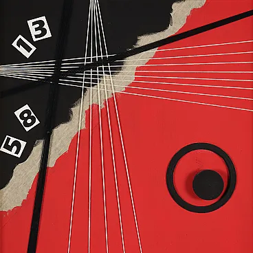 Acrilico su legno e collage di materiali vari. Al retro etichetta dell'artista con la firma e il titolo dell'opera.