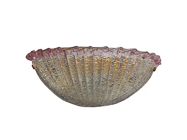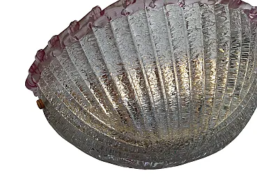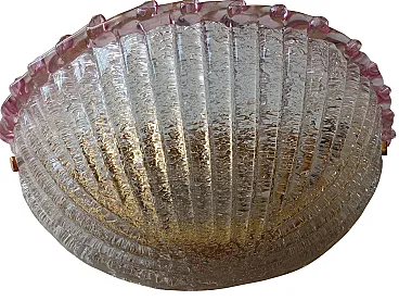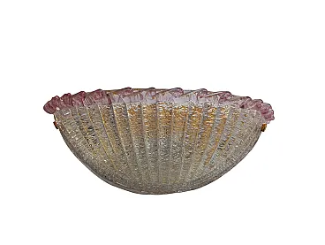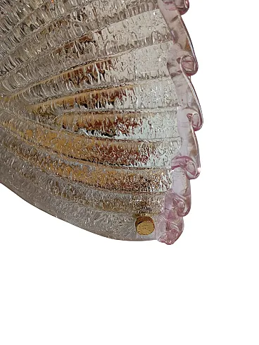 Applique vintage degli anni '80 in vetro di Murano, dalle dimensioni di 40 cm di larghezza, 17 cm di profondità e 17 cm di altezza. Il paralume è realizzato in vetro di Murano di un delicato rosa, caratterizzato, all’interno, da un effetto granulare ottenuto con la tradizionale tecnica della graniglia. In alto, alla bordatura, si notano onde in vetro di un rosa più intenso. Il design richiama la forma di una conchiglia, donando un'eleganza raffinata e un'atmosfera soffusa alla luce emessa. VETRO DI MURANO Il vetro di Murano è un tipo di vetro artistico prodotto sull'isola di Murano, situata nella laguna di Venezia, Italia. Questo vetro è rinomato per la sua bellezza, maestria artigianale e tradizione centenaria. Le caratteristiche distintive del vetro di Murano includono: 1. Colori vivaci e ricchi: Il vetro di Murano è famoso per la sua vasta gamma di colori vibranti. Gli artigiani utilizzano una varietà di pigmenti per creare sfumature ricche e intense. 2. Lavorazione a mano: La produzione del vetro di Murano è un'arte che richiede abilità e precisione. Gli artigiani seguono tecniche tradizionali tramandate di generazione in generazione, spesso modellando il vetro a mano con attrezzi specializzati. 3. Murrine: Le murrine sono piccole sezioni di vetro colorato disposte in un motivo specifico all'interno di una lastra più grande. Questa tecnica è tipica del vetro di Murano e può essere utilizzata per creare complessi disegni geometrici o immagini. 4. Lavorazione a lume: Alcuni oggetti di vetro di Murano vengono creati utilizzando la tecnica del "lavoro a lume", che coinvolge la manipolazione di tubi di vetro riscaldati su una fiamma per modellarli in forme desiderate. 5. Trasparenza e luminosità: Il vetro di Murano è noto per la sua trasparenza cristallina e la capacità di riflettere la luce in modo magnifico. Questo attributo contribuisce alla sua bellezza e lo rende ideale per la creazione di gioielli, lampadari e oggetti d'arte.