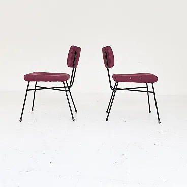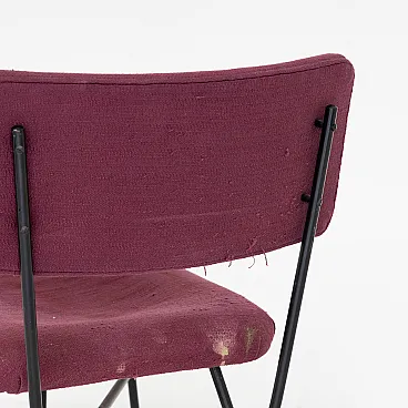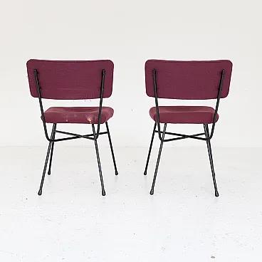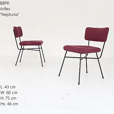 Coppia di sedie modello Neptunia, disegnate dallo studio BBPR per Arflex negli anni ’50. La struttura è in metallo verniciato nero, con seduta e schienale imbottiti e rivestiti nel tessuto bordeaux originale. Il design essenziale, con linee leggere e proporzioni ben bilanciate, è un esempio distintivo del razionalismo italiano del dopoguerra.