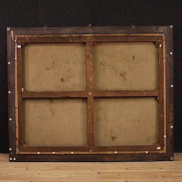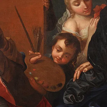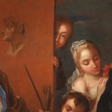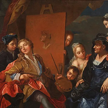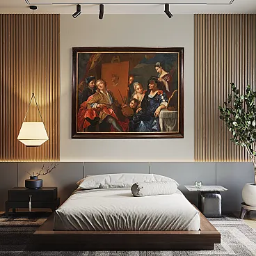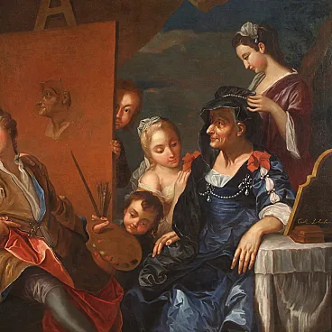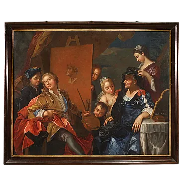 Splendido dipinto francese del XVIII secolo. Opera ad olio su tela raffigurante una scena di grande fascino, l'atelier del pittore. Quadro firmato in basso a destra dal celeberrimo Charles-André Van Loo (1705-1765). Nato in una famiglia di pittori di origine olandese lavorò anche a Torino per i Savoia e a Roma dove studiò nella scuola di Benedetto Luti. A Parigi fu poi nominato pittore ufficiale della corte di Luigi XV. (Il dipinto non è al momento accompagnato da expertise, ma è possibile richiederla previo pagamento dei relativi costi aggiuntivi). La composizione rappresenta una raffinata scena d'interno ambientata in un atelier. L'artista si ritrae mentre realizza un ritratto e attorno a lui si dispongono diversi personaggi. In un'atmosfera leggera ed elegante spiccano la ricchezza dei costumi e la preziosità dei tessuti che rimandano chiaramente al gusto rococó francese del periodo. Cornice del XX secolo in legno intagliato, laccato e dorato, con alcuni segni del tempo. Opera già restaurata con rintelo, sostituzione del telaio e ripresa del colore in piccoli punti. Nel complesso in buono stato conservativo. Luce dipinto H 120,5 x L 151,5 cm.