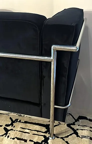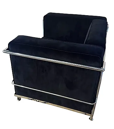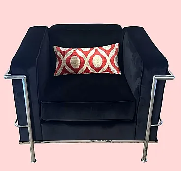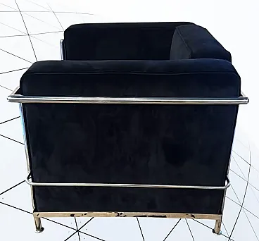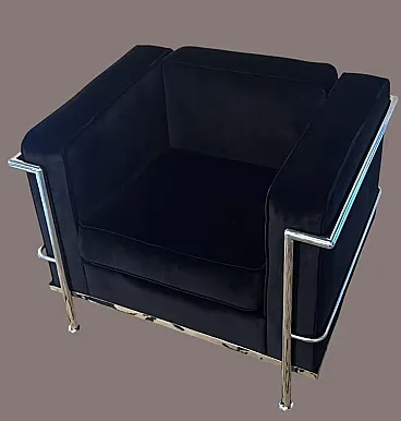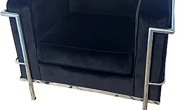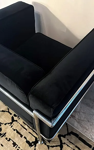 Ispirata all'iconico modello LC2 disegnato da Le Corbusier, Pierre Jeanneret, e Charlotte Perriand nel 1928 e successivamente prodotto da Cassina su licenza esclusiva a partire dal 1965, questa poltrona è una raffinata reinterpretazione italiana risalente agli anni '70. (1970-1975). Realizzato da un laboratorio specializzato del Nord Italia, si distingue per l'alta qualità dei materiali e la meticolosità della lavorazione, chiari indicatori della sua origine artigianale. La struttura in acciaio inossidabile lucido, con le sue linee pulite ed eleganti, riprende fedelmente il design del famoso "fauteuil grand confort". La tappezzeria è stata recentemente restaurata e rivestita in resistente velluto nero, conferendo alla sedia un aspetto sobrio e sofisticato, ideale sia per interni classici che per spazi più moderni o industriali. Pur non essendo un pezzo originale di Cassina, questa poltrona rimane una testimonianza autentica dell'abbraccio del design modernista italiano del dopoguerra e rappresenta un'ottima alternativa per chi cerca lo stile senza tempo della LC2 unito alla maestria di un articolo vintage realizzato artigianalmente. Grazie alla sua forma scultorea e compatta, questo pezzo si presta a una varietà di ambienti: perfetto accanto a un camino moderno, in uno studio raffinato o come punto focale in un soggiorno minimalista. Si abbina magnificamente a pavimenti in cemento, parquet in legno chiaro o tappeti geometrici e funziona bene accanto a un tavolino in vetro o metallo per esaltarne il carattere architettonico. È anche un elemento di contrasto per gli interni più classici, dove aggiunge un tocco di design senza tempo. La poltrona è stata completamente restaurata ed è in ottime condizioni. Dimensioni: Larghezza: 90 cm (35.4 in) Profondità: 73 cm (28.7 in) Altezza: 69 cm (27.2 in) Altezza della seduta: 43 cm (16,9")
