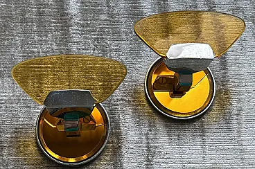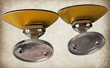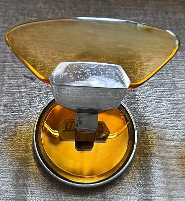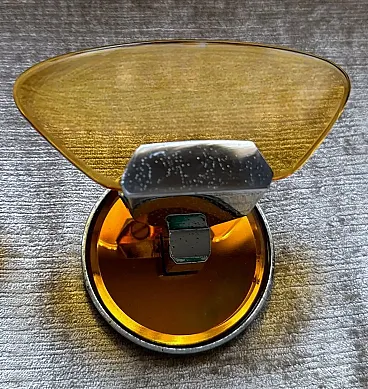 Ogni gancio è caratterizzato da una robusta struttura in metallo: la base circolare ospita un inserto in cristallo giallo, mentre sul lato inferiore sono presenti i fori di montaggio per l'installazione a parete. Un braccio metallico perpendicolare è fissato alla base e termina con un cristallo giallo sagomato con bordi morbidamente arrotondati. Una costruzione semplice con un'estetica razionale, innovativa e funzionale. Questo design corrisponde a un modello brevettato (come indicato sotto la base metallica), prodotto da Veca tra il 1970 e il 1973. Questa coppia potrebbe essere il risultato di una collaborazione con Fontana Arte. Veca è un produttore italiano noto per la produzione di accessori per il bagno in vetro e metallo di alta qualità, particolarmente attivo durante l'era del design moderno della metà del XX secolo. Sebbene le informazioni storiche sull'azienda siano limitate, Veca è riconosciuta per l'eleganza e l'artigianalità delle sue creazioni, che spesso si distinguono per l'uso di vetro colorato e finiture cromate. Fontana Arte, fondata a Milano nel 1932 da Luigi Fontana e Gio Ponti, è un nome di spicco del design italiano. Specializzata nella lavorazione del vetro e negli arredi decorativi, l'azienda è particolarmente rinomata per i suoi pionieristici progetti di illuminazione. Per tutti gli anni '60 e '70, Fontana Arte collaborò con molti designer di spicco, incorporando costantemente il vetro come materiale caratteristico. Sebbene nessuna fonte ufficiale confermi una collaborazione a lungo termine tra Veca e Fontana Arte, è plausibile che Veca abbia fornito componenti o prodotto oggetti per Fontana Arte in determinati periodi, data la comune esperienza nell'artigianato del vetro e del metallo. Con le loro linee pulite, il design essenziale e l'uso ben bilanciato di elementi in cristallo, questi ganci da parete sono pezzi unici, eleganti e versatili, perfetti per qualsiasi ambiente interno. La coppia è in buone condizioni generali ma presenta un'ossidazione visibile sulle superfici nichelate, come si vede nelle foto. L'acquirente può scegliere di mantenere la patina originale, come abbiamo fatto noi, o di pulire i pezzi con un prodotto decalcificante di qualità per ripristinare la loro lucentezza. Dimensioni: Larghezza 12 cm (4,7 in), Altezza 10 cm (3,9 in), Profondità 7 cm (2,8 in)