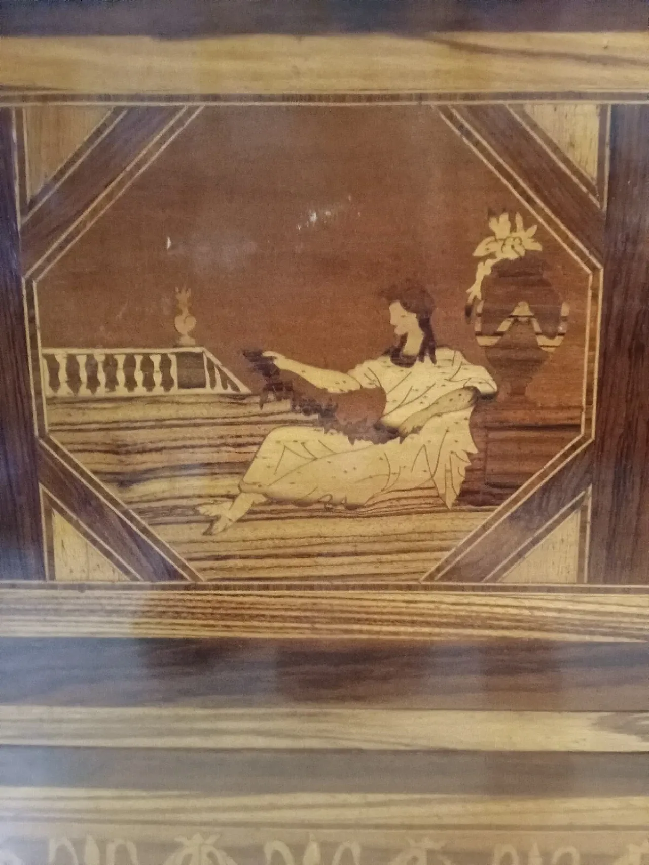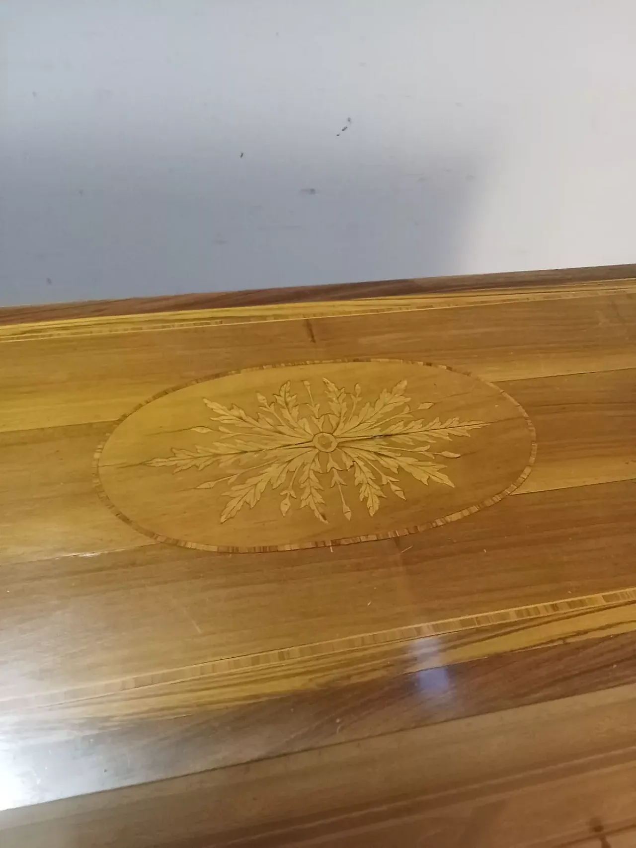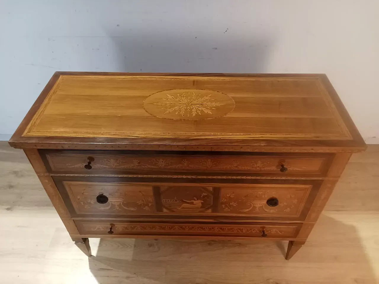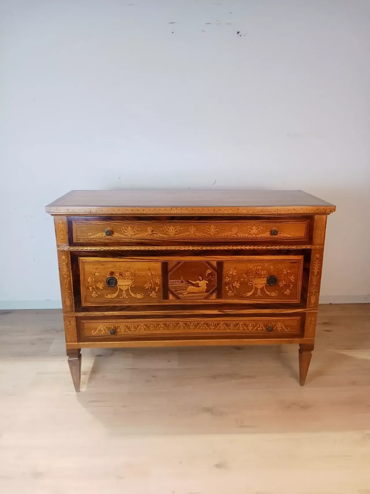 Raffinato cassettone in stile Luigi XVI, realizzato con lastronatura in noce e impreziosito da intarsi e rosoni decorati con figure di gusto neoclassico. Presenta tre cassetti, di cui il centrale di dimensioni maggiori, pomelli in ottone e un rosone frontale intarsiato con scena classica. Le gambe sono troncopiramidali con strozzatura, in linea con lo stile dell’epoca. Un mobile di grande eleganza, ideale per ambienti classici o come elemento di contrasto in interni moderni. Epoca: metà '900. Condizioni molto buone, subito collocabile.