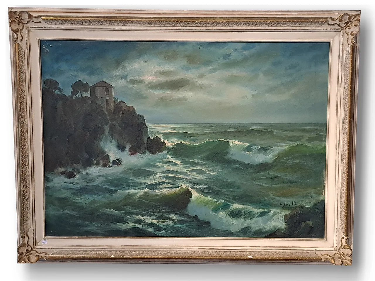 Il dipinto raffigura una scena marina con un forte impatto drammatico, tipica della produzione di Giuseppe Caselli, pittore ligure noto per le sue vedute paesaggistiche e marine.