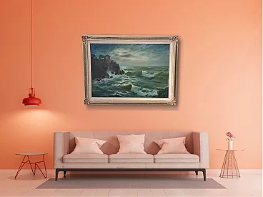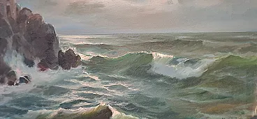 Soggetto: La composizione è dominata da un mare in burrasca, con onde impetuose che si infrangono con forza contro una scogliera rocciosa sulla sinistra. Sulla sommità della scogliera, si distingue una costruzione circondata da alcuni alberi.