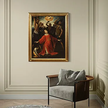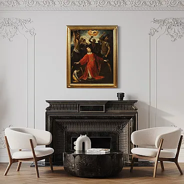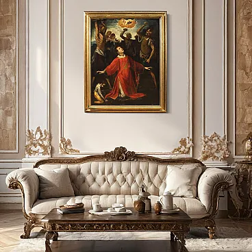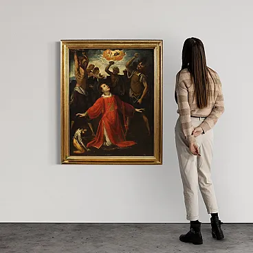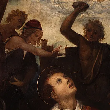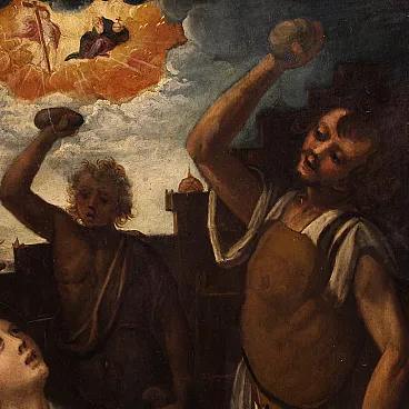 Raro quadro italiano religioso della prima metà del XVII secolo. Opera ad olio su tavola raffigurante il martirio di Santo Stefano, di difficile reperibilità. Al centro della composizione troviamo il primo martire Cristiano, con la tradizionale dalmatica rossa da diacono, mentre subisce la lapidazione. Attorno a lui vediamo i suoi carnefici intenti a scagliare delle grandi pietre. Sopra al Santo una visione celeste, una gloria di nuvole con Dio Padre e Cristo pronti ad accogliere l'anima del Santo. Dipinto di notevole qualità pittorica, il cromatismo caldo, i panneggi ben studiati e la drammaticità dei gesti richiamano la scuola lombarda tardo manierista. Cornice del XX secolo in legno intagliato e dorato, con alcuni segni del tempo. Quadro già restaurato con ripresa del colore in alcuni punti, nel complesso in buono stato conservativo. Luce dipinto H 104 x L 82 cm.