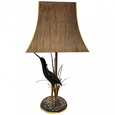 Una lampada da tavolo Airone in ottone e resina nera disegnata da Lanciotto e Galeotti nel 1970 per L'Originale. L'altezza senza paralume è di 65 cm. Funziona a 110-240 volt e necessita di una lampadina normale e27. L'ottone è in patina originale, il paralume originale ha qualche piccolo difetto.