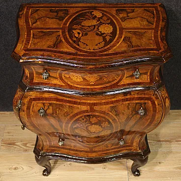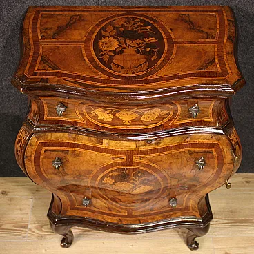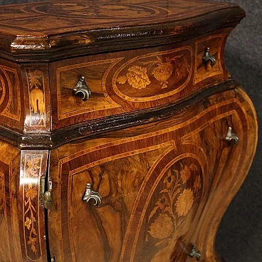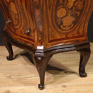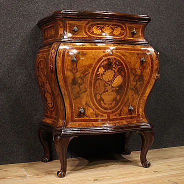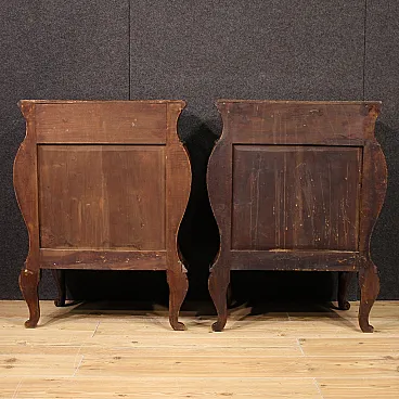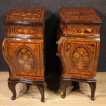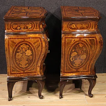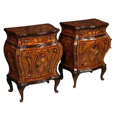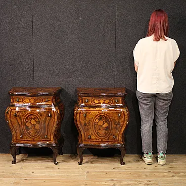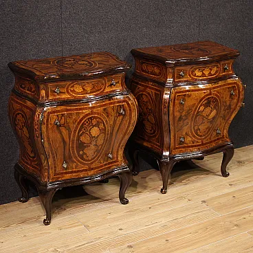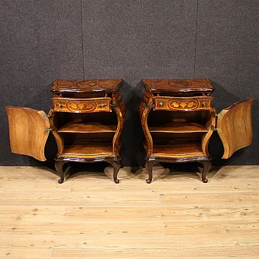 Coppia comodini lombardi della metà del XX secolo. Mobili mossi e bombati in stile Luigi XV, finemente intarsiati con decori floreali in legno di noce, radica, bois de rose, acero, legno ebanizzato e legni da frutto. Comodini da camera o salotto, di bella linea e proporzione, per antiquari e arredatori. Mobili muniti di un’anta e un cassetto, di buona capacità. Comodini facenti parte di una camera completa di comò, armadio a due ante, letto matrimoniale e toeletta (richiedi il prezzo in blocco, se disponibile). Sorretti da gambe ebanizzate con piedini a ricciolo, si presentano strutturalmente sani e in buono stato conservativo.