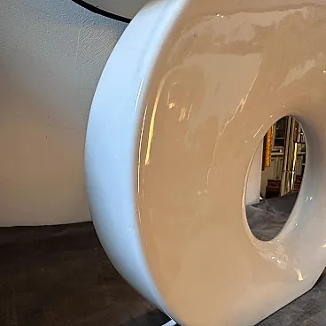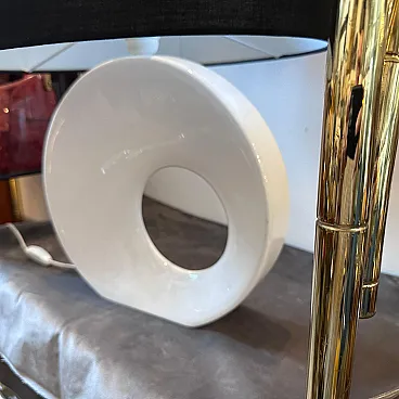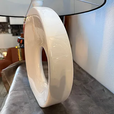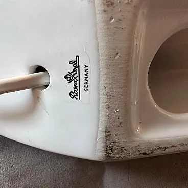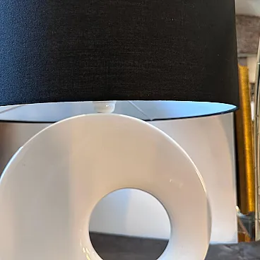 Una lampada da tavolo modernista in porcellana bianca disegnata e prodotta in Germania da Rosenthal negli anni Novanta; la base in porcellana ha una forma rotonda con un foro asimmetrico al centro, il nuovo paralume è cilindrico in tessuto nero, il tutto in ottime condizioni. È funzionante e riporta la scritta Rosenthal Germany sul fondo. Gli anni '90 erano un periodo in cui il design modernista era ancora influente e la casa di design tedesca Rosenthal era nota per le sue creazioni in porcellana di alta qualità. Questa lampada da tavolo di Rosenthal mostra l'estetica elegante e minimalista che ha caratterizzato l'epoca. La lampada presenta un design pulito e geometrico, con un'enfasi sulla semplicità e sulla funzionalità. La base in porcellana offre una superficie liscia e lucente che esalta l'aspetto elegante della lampada. Il paralume è un complemento del design modernista della base ed è stato progettato per diffondere la luce in modo uniforme e creare una luce soffusa e ambientale. Per quanto riguarda lo schema di colori, la lampada sarà principalmente di colore bianco o bianco sporco, riflettendo la preferenza modernista per un'estetica neutra e minimalista. La semplicità del design e l'uso della porcellana bianca creano un senso di eleganza senza tempo che si adatta perfettamente a diversi stili di interni. Questa lampada da tavolo di Rosenthal è un pezzo forte che unisce funzionalità e arte. Le sue linee pulite, l'artigianato di alta qualità e il design minimalista lo rendono un'aggiunta preziosa a qualsiasi spazio contemporaneo o di ispirazione vintage.