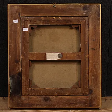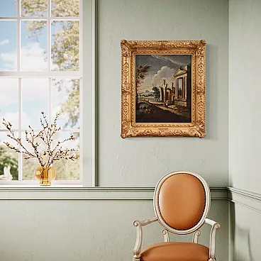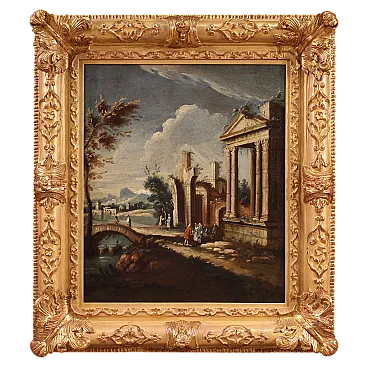 Raffinato paesaggio italiano della seconda metà del XVIII secolo. Quadro ad olio su tela raffigurante una splendida veduta con rovine antiche e figure in abiti veneziani, di notevole qualità pittorica e ricca di minuziosi dettagli. L'opera si inserisce chiaramente nella tradizione del capriccio architettonico veneziano settecentesco e l'etichetta sul retro propone il nome di Antonio Visentini (1688-1782), noto vedutista e incisore (Il dipinto non è al momento accompagnato da expertise, ma è possibile richiederla previo pagamento dei relativi costi aggiuntivi). Spettacolare cornice del XX secolo in legno intagliato e dorato, con alcuni segni del tempo. Dipinto già restaurato con rintelo, sostituzione del telaio e ripresa del colore in piccoli punti. Nel complesso in buono stato conservativo. Luce dipinto H 53 x L 44,5 cm.
