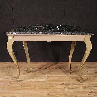 Console italiana della metà del XX secolo. Mobile a gamba alta, in legno scolpito, laccato e dorato (tinta bronzo) di bella linea e piacevole arredamento. Piano in marmo originale di buona misura e servizio, incollato al mobile. Console da parete, di ottima proporzione, facilmente inseribile in diversi punti della casa. Mobile di piacevole arredamento, in bella patina, per antiquari e arredatori. In buone condizioni e strutturalmente sana, con qualche piccola caduta di colore.
